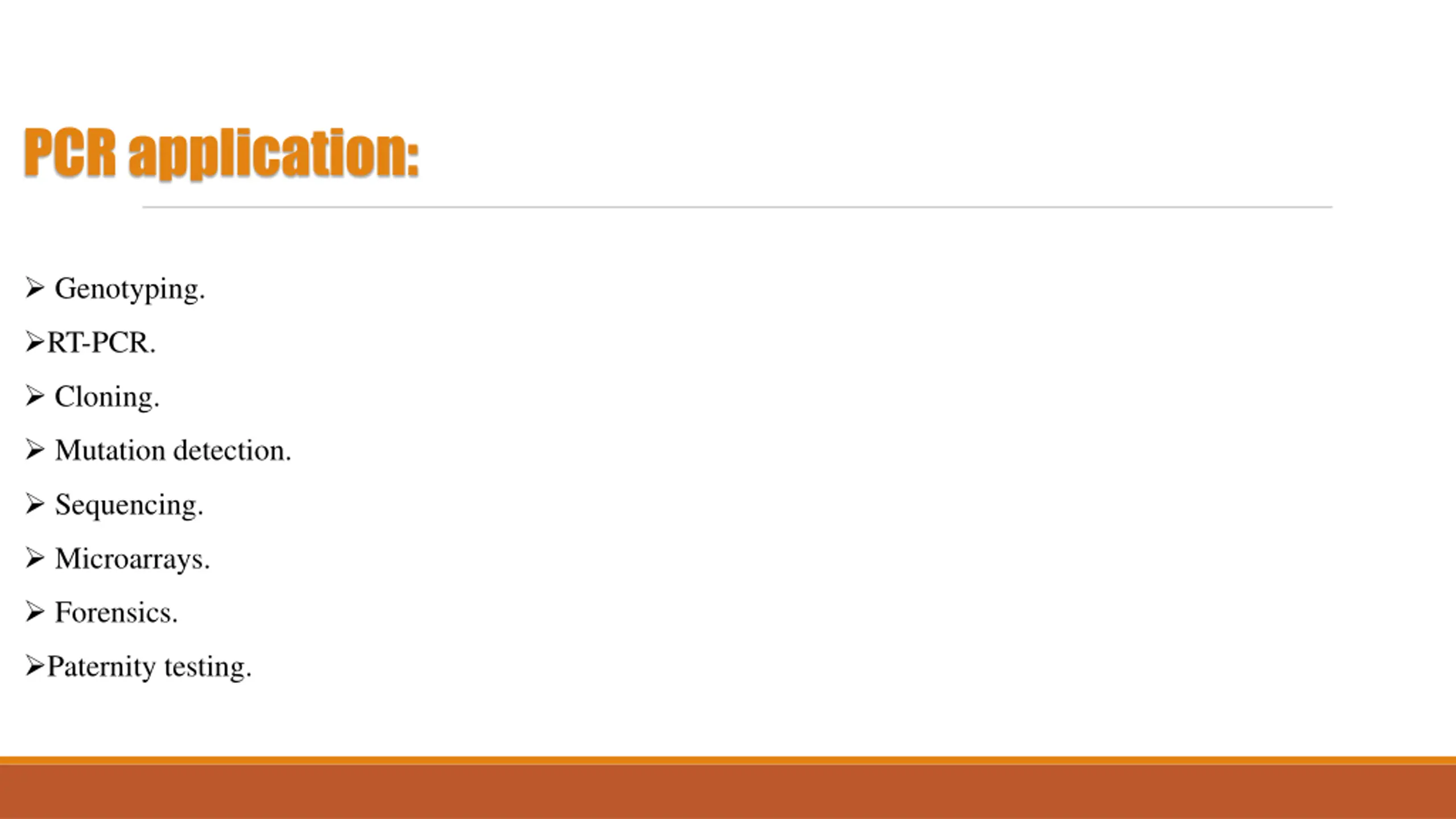 14. PCR application:  Genotyping. RT-PCR.  Cloning.  Mutation detection.  Sequencing.  Microarrays.  Forensics. Paternity testing.