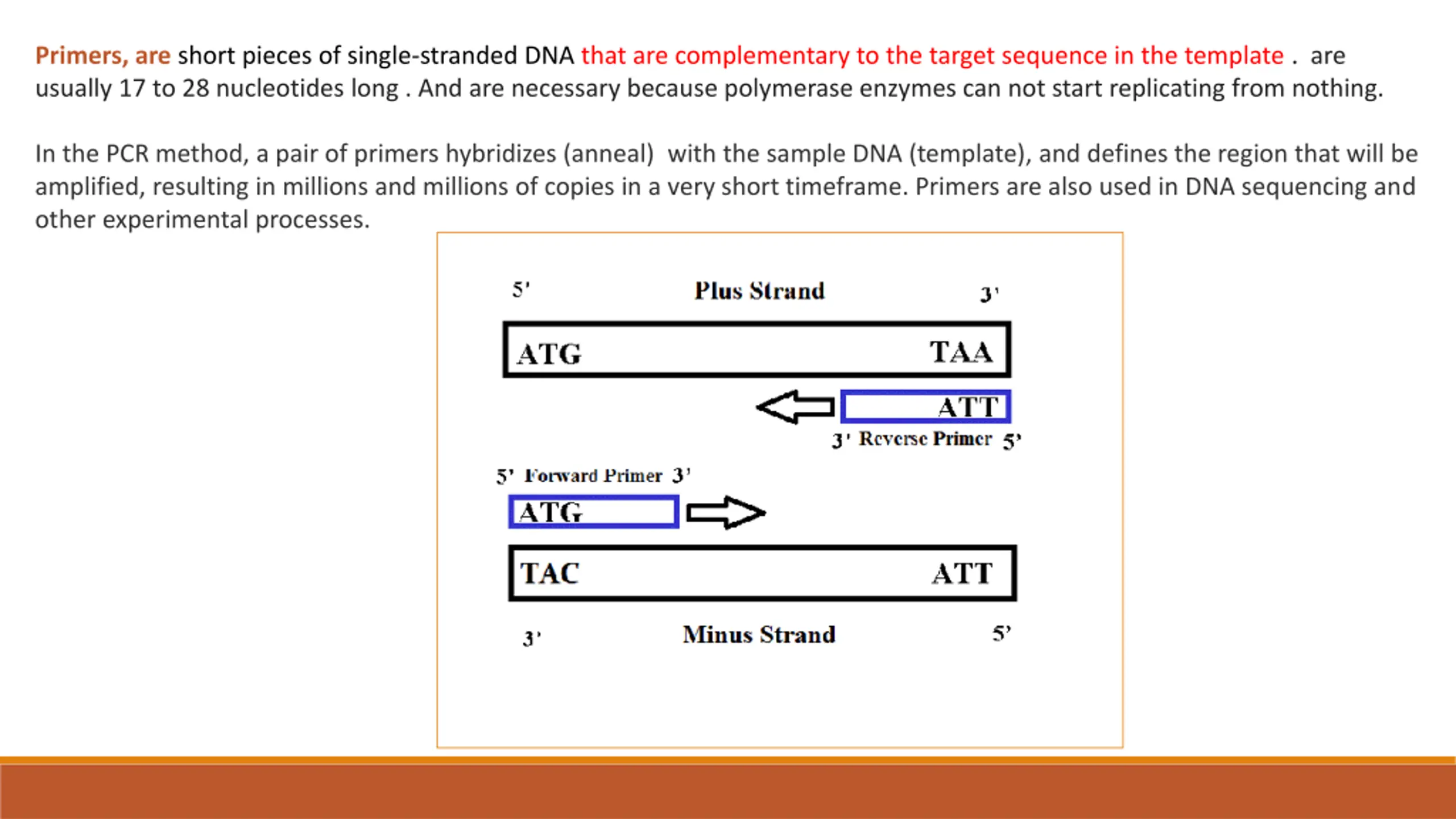 2. Primers, are short pieces of single-stranded DNA that are complementary to the target sequence in the template . are usually 17 to 28 nucleotides long . And are necessary because polymerase enzymes can not start replicating from nothing. In the PCR method, a pair of primers hybridizes (anneal) with the sample DNA (template), and defines the region that will be amplified, resulting in millions and millions of copies in a very short timeframe. Primers are also used in DNA sequencing and other experimental processes.