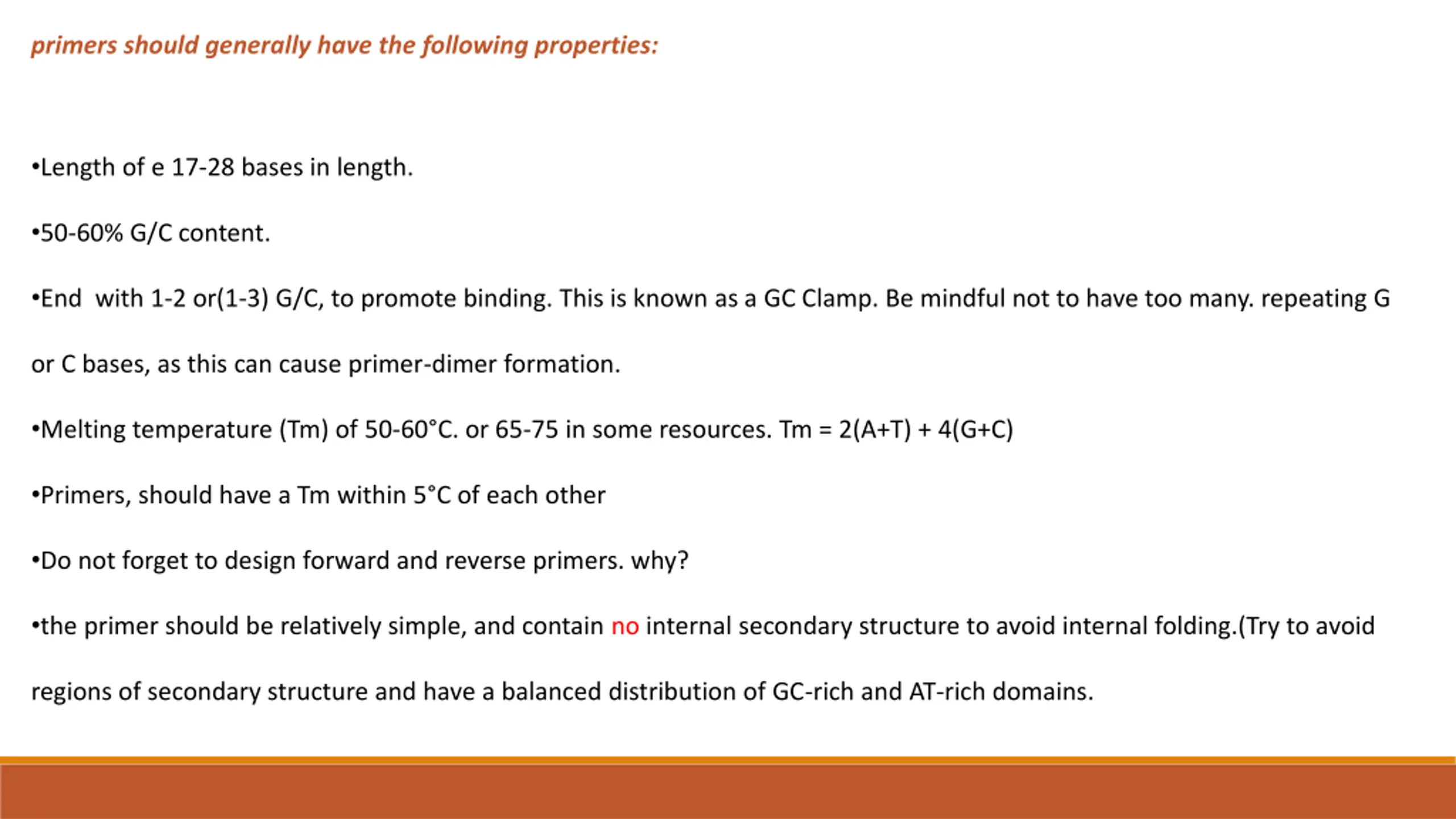 4. primers should generally have the following properties: •Length of e 17-28 bases in length. •50-60% G/C content. •End with 1-2 or(1-3) G/C, to promote binding. This is known as a GC Clamp. Be mindful not to have too many. repeating G or C bases, as this can cause primer-dimer formation. •Melting temperature (Tm) of 50-60°C. or 65-75 in some resources. Tm = 2(A+T) + 4(G+C) •Primers, should have a Tm within 5°C of each other •Do not forget to design forward and reverse primers. why? •the primer should be relatively simple, and contain no internal secondary structure to avoid internal folding.(Try to avoid regions of secondary structure and have a balanced distribution of GC-rich and AT-rich domains.