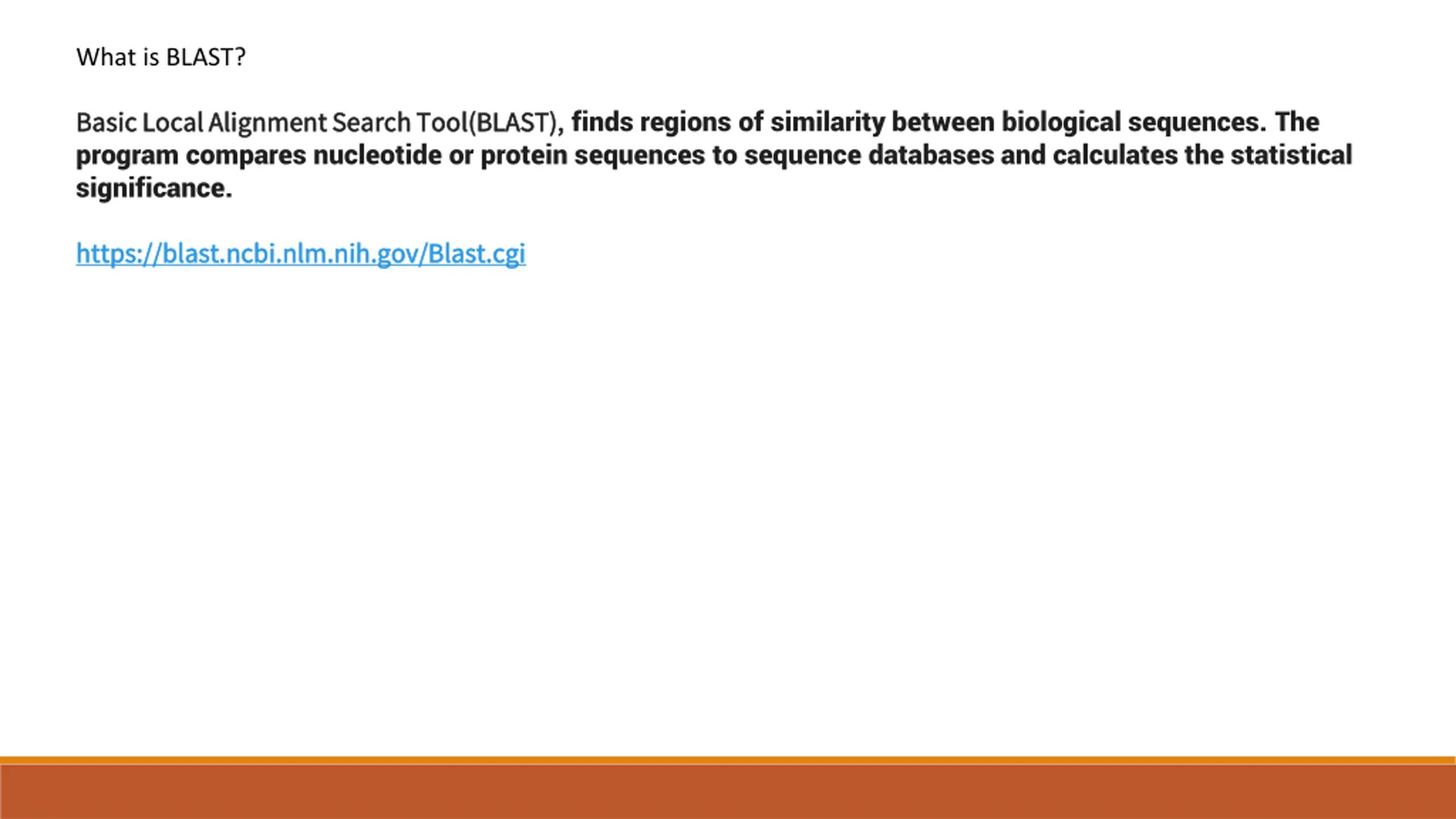 7. What is BLAST? Basic Local Alignment Search Tool(BLAST), Basic Local Alignment Search Tool(BLAST), finds regions of similarity between biological sequences. The program compares nucleotide or protein sequences to sequence databases and calculates the statistical significance. https://blast.ncbi.nlm.nih.gov/Blast.cgi https://blast.ncbi.nlm.nih.gov/Blast.cgi