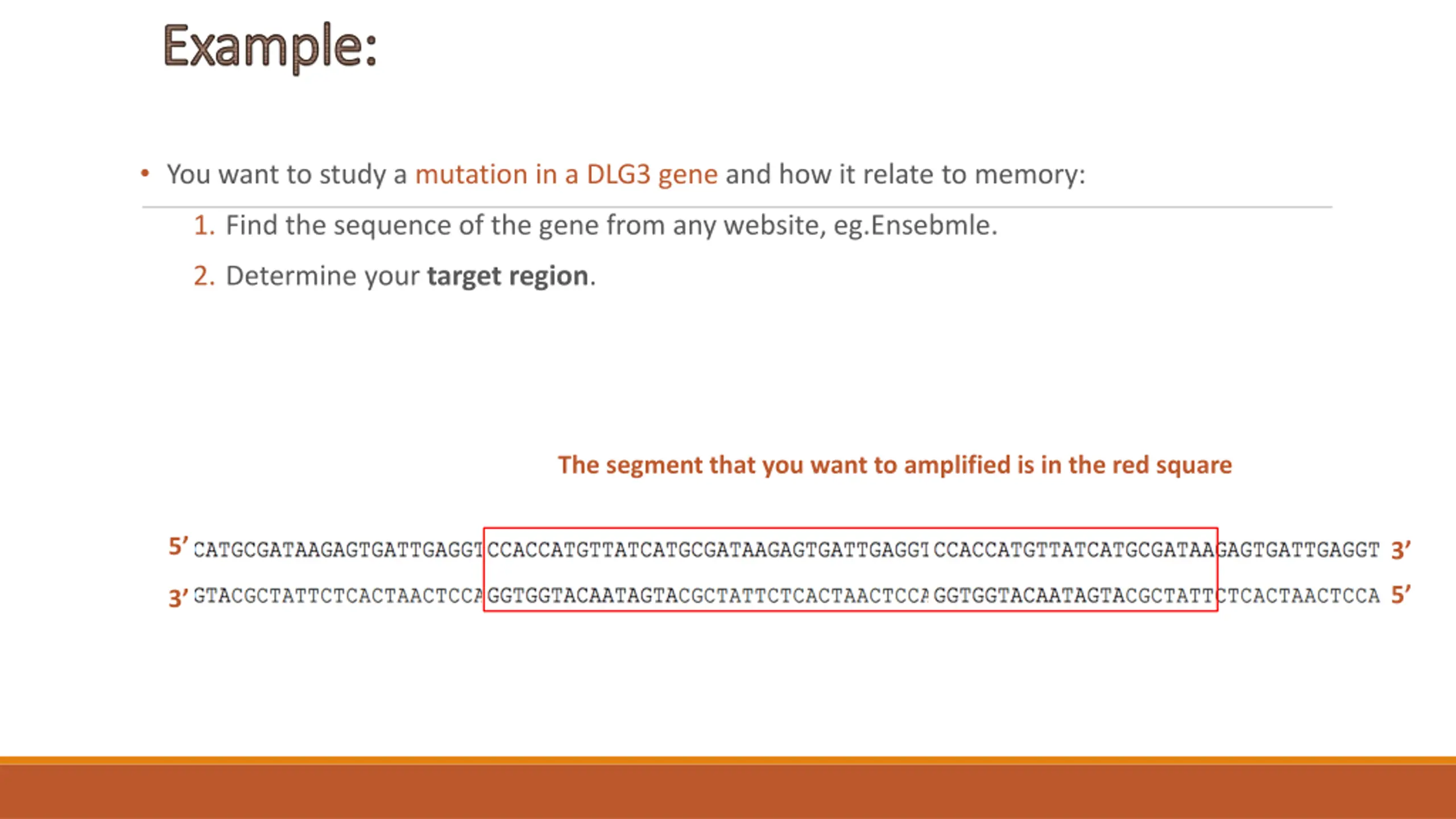 8. • You want to study a mutation in a DLG3 gene and how it relate to memory: 1. Find the sequence of the gene from any website, eg.Ensebmle. 2. Determine your target region. The segment that you want to amplified is in the red square 5’ 3’ 5’ 3’