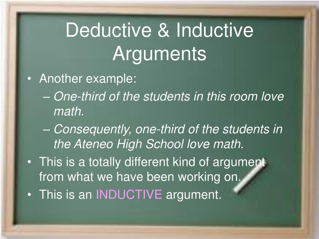 Deductive & Inductive Arguments • Another example: • One-third of the students in this room love math. • Consequently, one-third of the students in the Ateneo High School love math. • This is a totally different kind of argument from what we have been working on. • This is an INDUCTIVE argument.