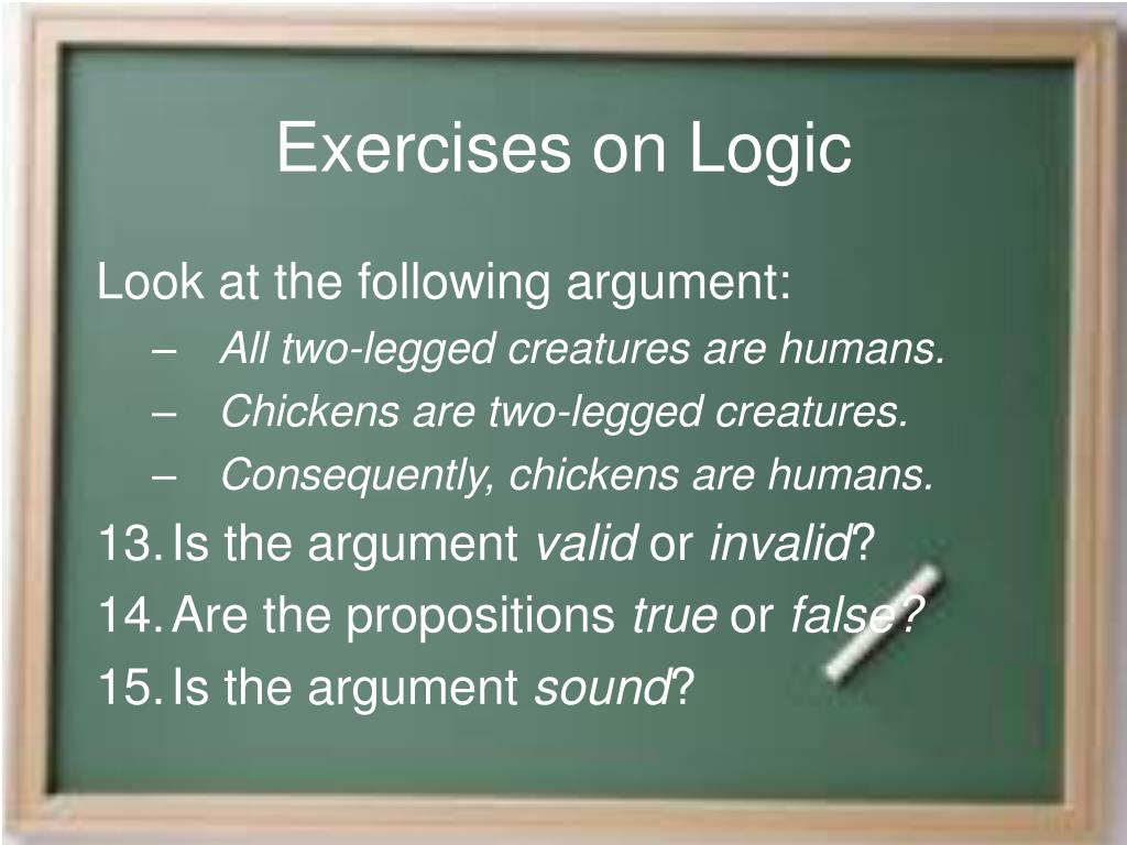 Exercises on Logic Look at the following argument: • All two-legged creatures are humans. • Chickens are two-legged creatures. • Consequently, chickens are humans. • Is the argument valid or invalid? • Are the propositions true or false? • Is the argument sound?