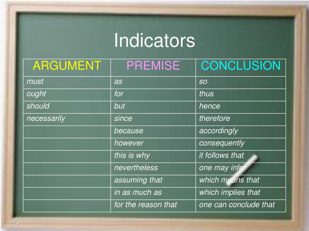 Form of Argument • Thus, in the argument: “Classes should be suspended because of the terrible weather,” the CONCLUSION is “Classes should be suspended,” and the PREMISE is “the terrible weather.”