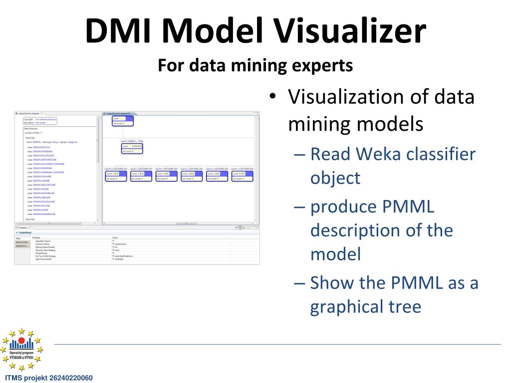 DMI Model VisualizerFor data mining experts Visualization of data mining models Read Weka classifier object produce PMML description of the model Show the PMML as a graphical tree