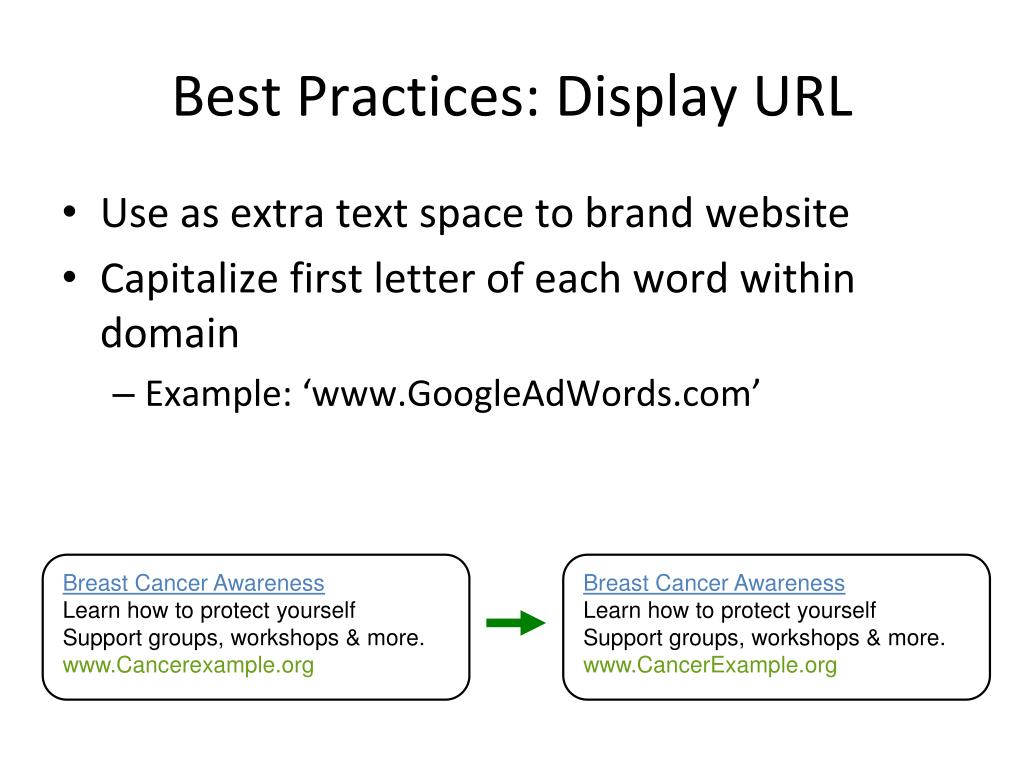 Breast Cancer AwarenessLearn how to protect yourself Support groups, workshops & more. www.Cancerexample.org Breast Cancer AwarenessLearn how to protect yourself Support groups, workshops & more. www.CancerExample.org Best Practices: Display URL • Use as extra text space to brand website • Capitalize first letter of each word within domain • Example: ‘www.GoogleAdWords.com’