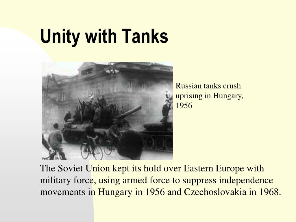 Unity with Tanks Russian tanks crush uprising in Hungary, 1956 The Soviet Union kept its hold over Eastern Europe with military force, using armed force to suppress independence movements in Hungary in 1956 and Czechoslovakia in 1968.