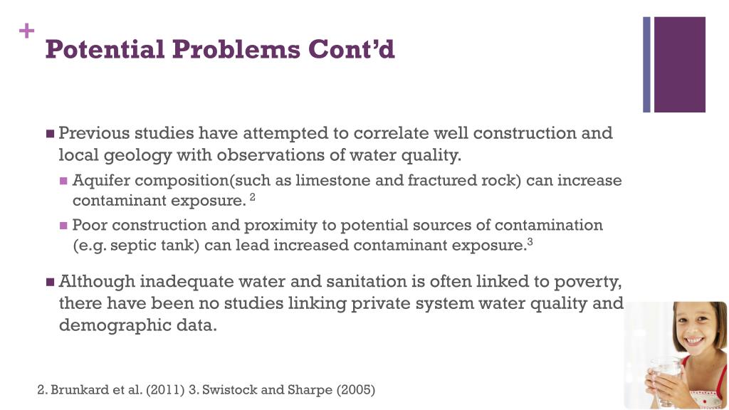 Potential Problems Cont’d • Previous studies have attempted to correlate well construction and local geology with observations of water quality. • Aquifer composition(such as limestone and fractured rock) can increase contaminant exposure. 2 • Poor construction and proximity to potential sources of contamination (e.g. septic tank) can lead increased contaminant exposure.3 • Although inadequate water and sanitation is often linked to poverty, there have been no studies linking private system water quality and demographic data. 2. Brunkard et al. (2011) 3. Swistock and Sharpe (2005)