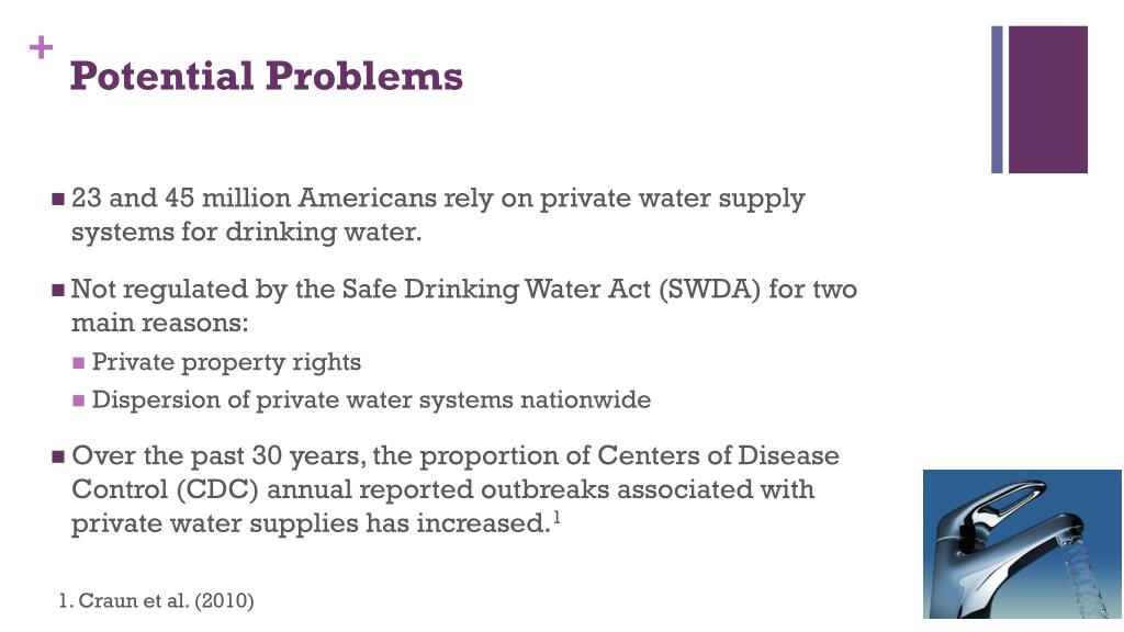 Potential Problems • 23 and 45 million Americans rely on private water supply systems for drinking water. • Not regulated by the Safe Drinking Water Act (SWDA) for two main reasons: • Private property rights • Dispersion of private water systems nationwide • Over the past 30 years, the proportion of Centers of Disease Control (CDC) annual reported outbreaks associated with private water supplies has increased.1 1. Craun et al. (2010)