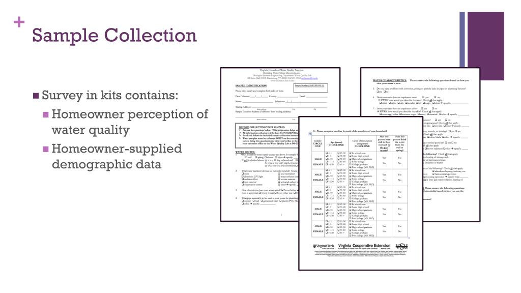 Sample Collection • Survey in kits contains: • Homeowner perception of water quality • Homeowner-supplied demographic data