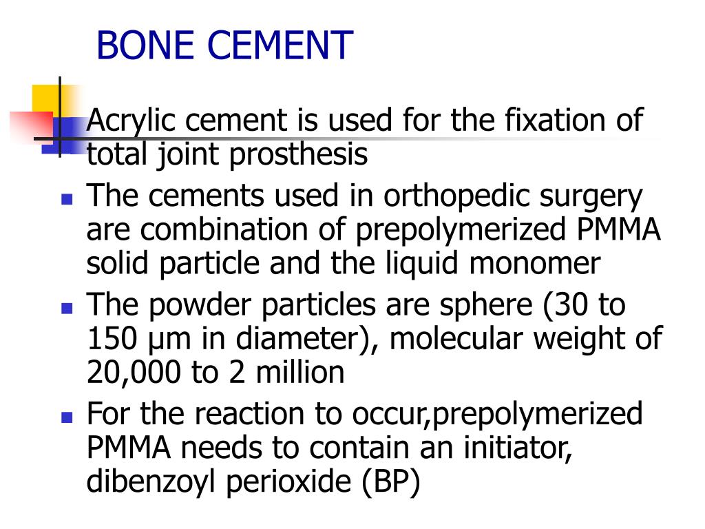 BONE CEMENT • Acrylic cement is used for the fixation of total joint prosthesis • The cements used in orthopedic surgery are combination of prepolymerized PMMA solid particle and the liquid monomer • The powder particles are sphere (30 to 150 µm in diameter), molecular weight of 20,000 to 2 million • For the reaction to occur,prepolymerized PMMA needs to contain an initiator, dibenzoyl perioxide (BP)