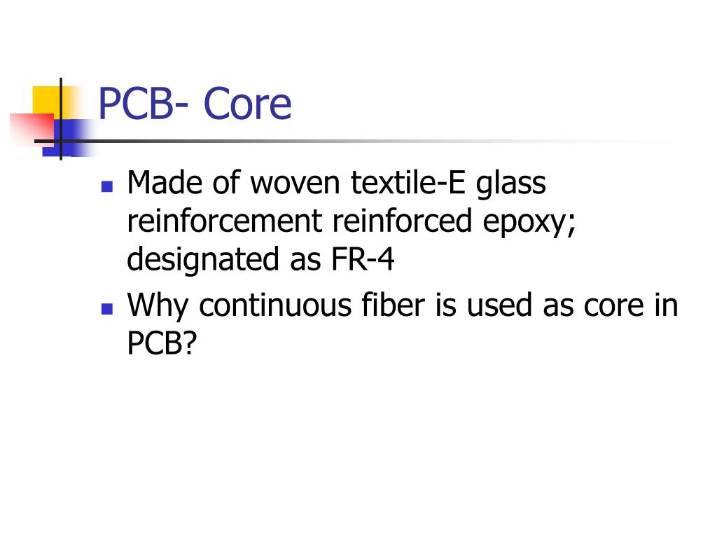PCB- Core • Made of woven textile-E glass reinforcement reinforced epoxy; designated as FR-4 • Why continuous fiber is used as core in PCB?