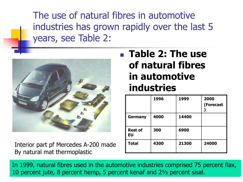 The use of natural fibres in automotive industries has grown rapidly over the last 5 years, see Table 2: • Table 2: The use of natural fibres in automotive industries Interior part pf Mercedes A-200 made By natural mat thermoplastic In 1999, natural fibres used in the automotive industries comprised 75 percent flax, 10 percent jute, 8 percent hemp, 5 percent kenaf and 2½ percent sisal.