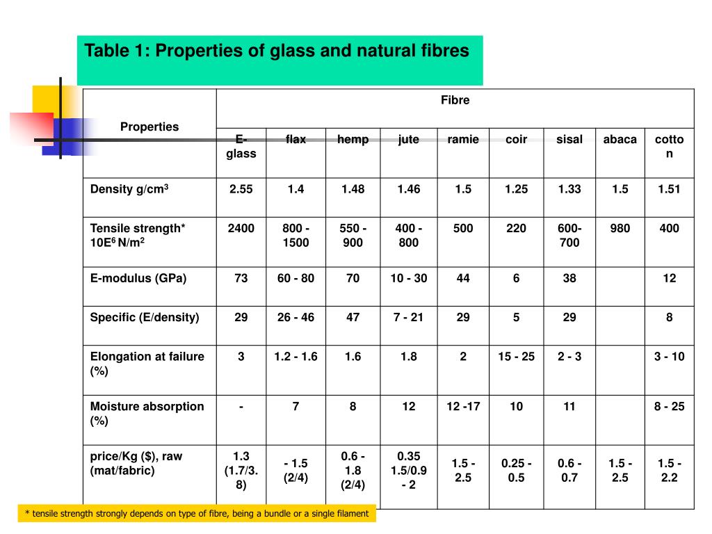 Table 1: Properties of glass and natural fibres * tensile strength strongly depends on type of fibre, being a bundle or a single filament