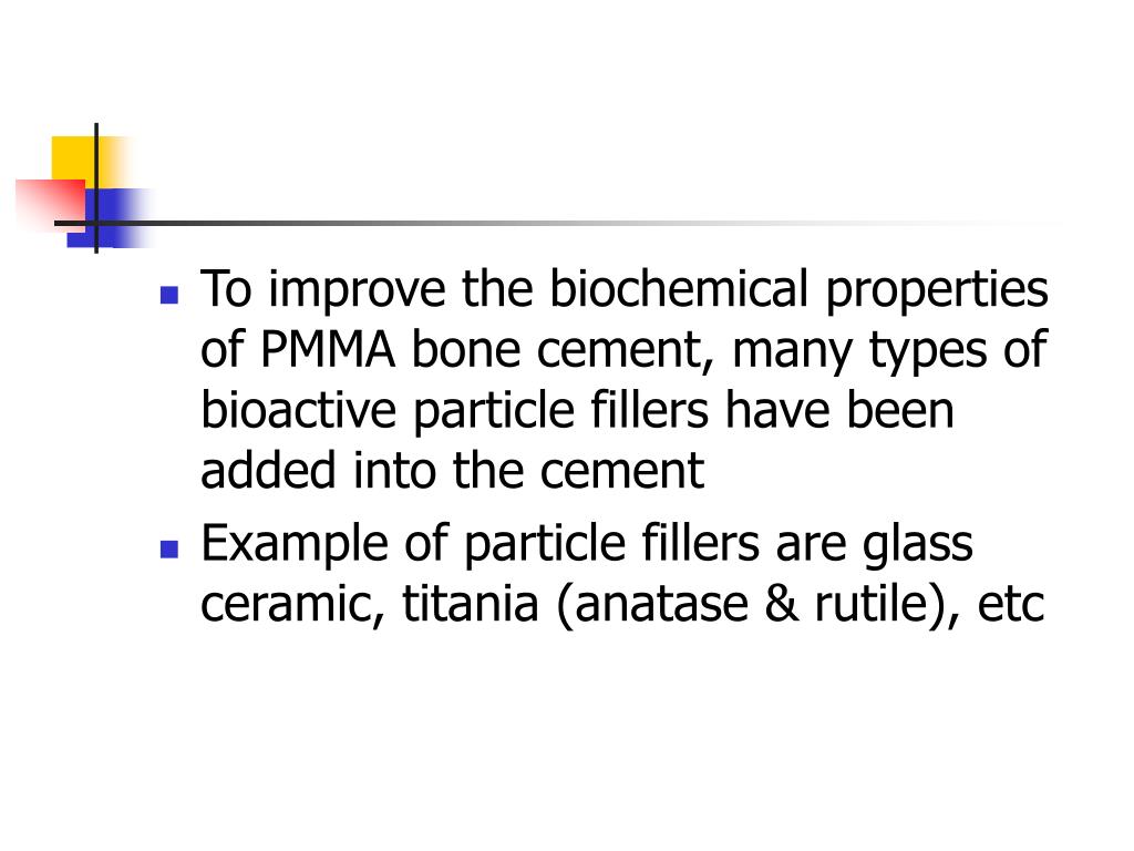 To improve the biochemical properties of PMMA bone cement, many types of bioactive particle fillers have been added into the cement • Example of particle fillers are glass ceramic, titania (anatase & rutile), etc