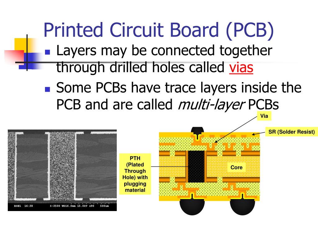 Core Printed Circuit Board (PCB) • Layers may be connected together through drilled holes called vias • Some PCBs have trace layers inside the PCB and are called multi-layer PCBs Via SR (Solder Resist) PTH (Plated Through Hole) with plugging material