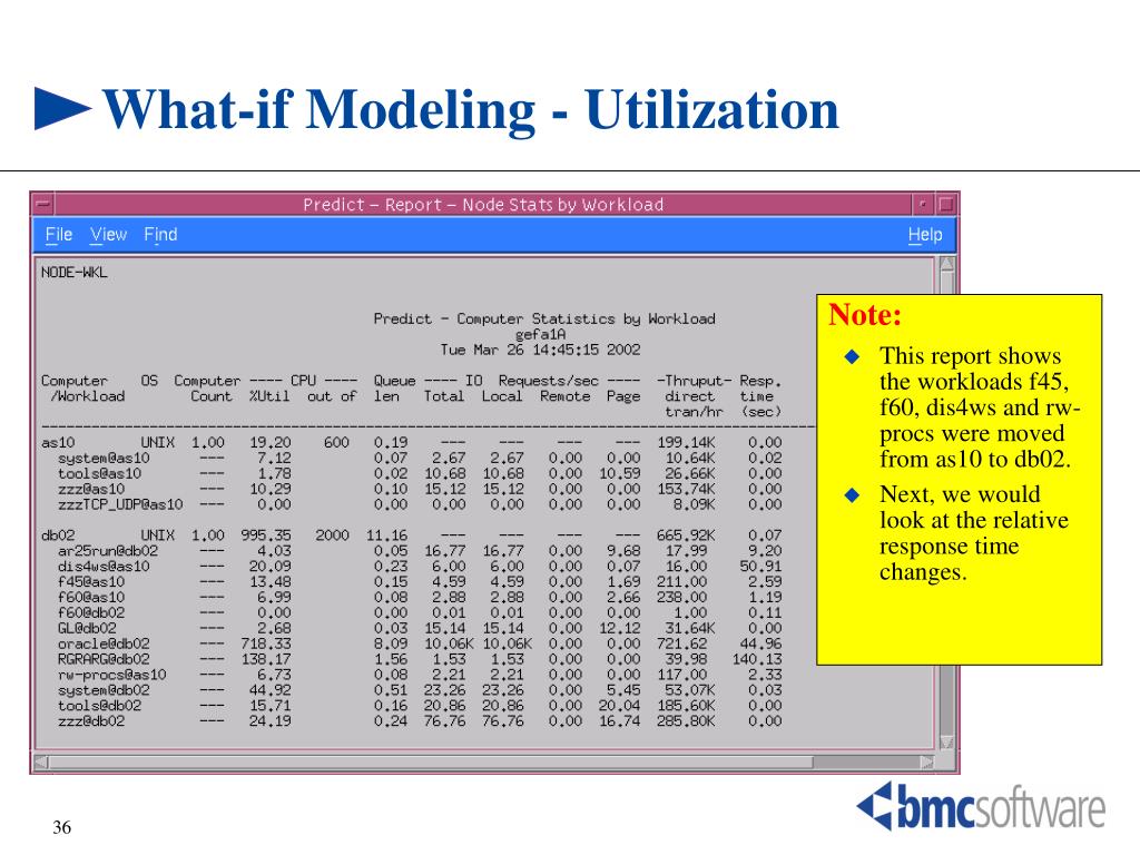 What-if Modeling - Response Time • Note: • This report shows the workloads f45, f60, dis4ws and rw-procs about 27% slower after they were moved. • The reason is that db02 has slower processor speed (25.27 specint95 per processor) than as10 (32.96 specint95), even though it has 20 processors versus 6 processors at as10. • Let’s see what happened when db02 is changed to a SUN F6800/16 machine.