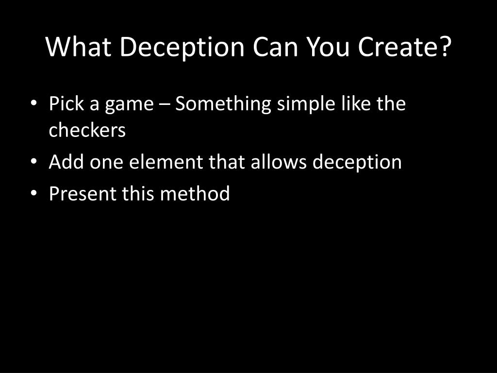 What Deception Can You Create? • Pick a game – Something simple like the checkers • Add one element that allows deception • Present this method