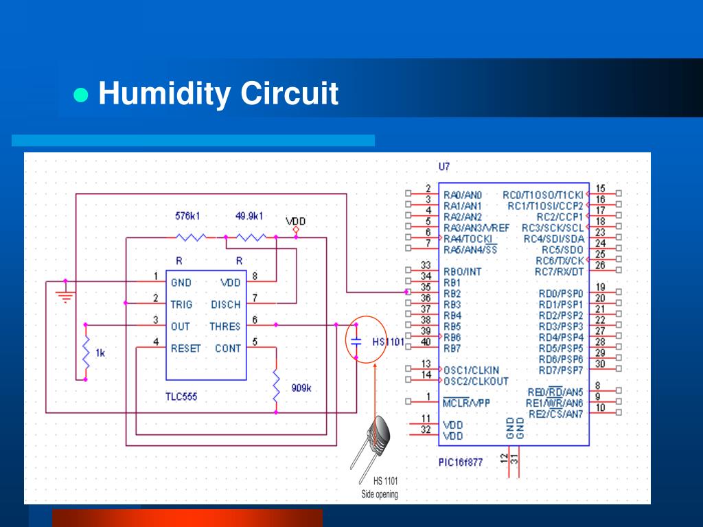 Common hardware components • Humidity Sensor • There are several devices used to measure relative humidity. • A stable design using hygrometer HS1101 with a TLC-555 timer . • RH = 565.1− 0.0767 f RH : Relative Humidity
