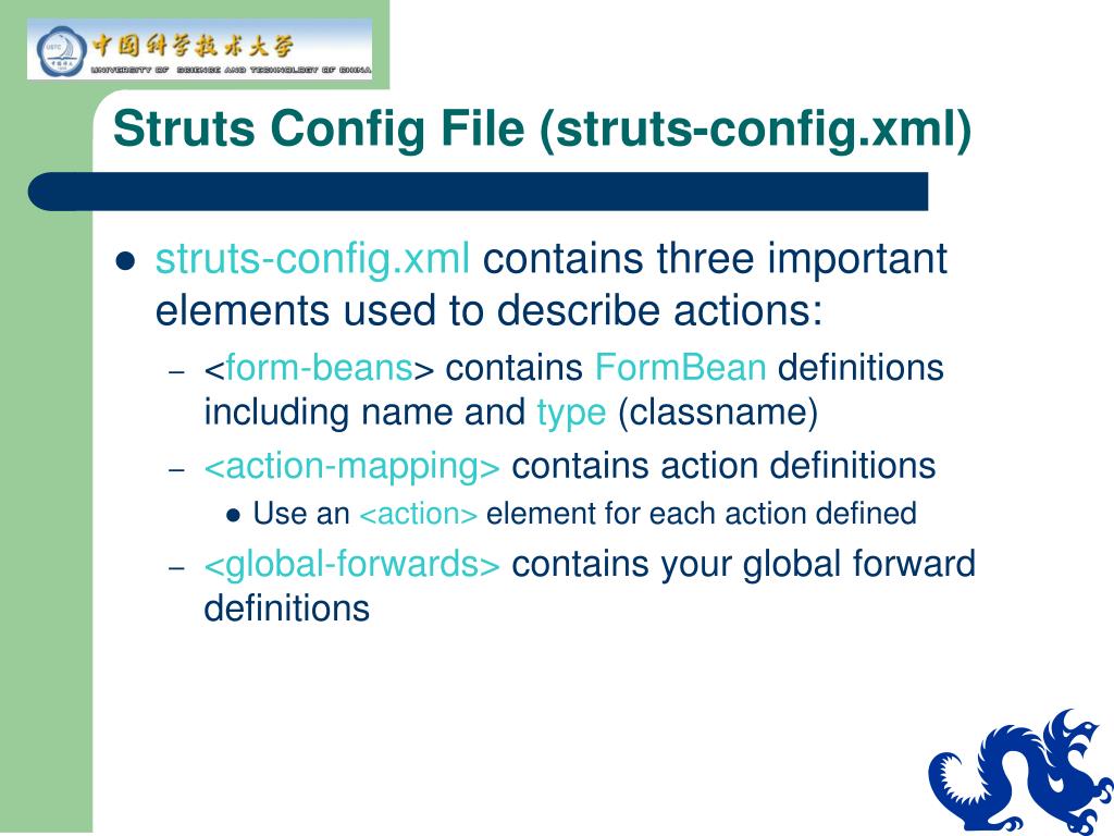 Struts Config File (struts-config.xml) • struts-config.xml contains three important elements used to describe actions: • <form-beans> contains FormBean definitions including name and type (classname) • <action-mapping> contains action definitions • Use an <action> element for each action defined • <global-forwards> contains your global forward definitions