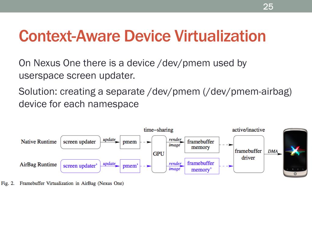 Context-Aware Device Virtualization On Nexus One there is a device /dev/pmem used by userspace screen updater. Solution: creating a separate /dev/pmem (/dev/pmem-airbag) device for each namespace