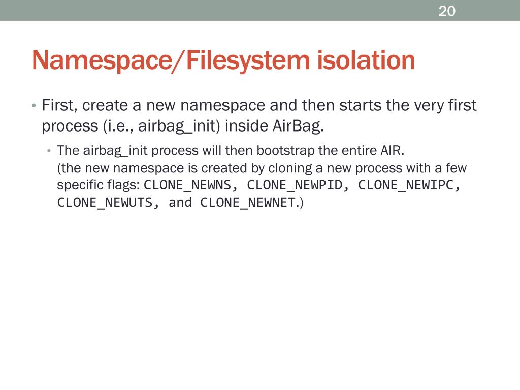 Namespace/Filesystem isolation • First, create a new namespace and then starts the very first process (i.e., airbag_init) inside AirBag. • The airbag_init process will then bootstrap the entire AIR.(the new namespace is created by cloning a new process with a few specific flags: CLONE_NEWNS, CLONE_NEWPID, CLONE_NEWIPC, CLONE_NEWUTS, and CLONE_NEWNET.)