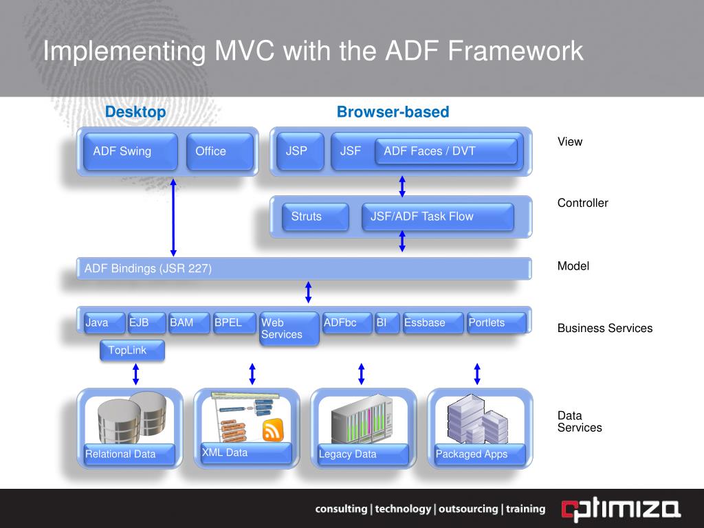 Implementing MVC with the ADF Framework Desktop Browser-based JSF JSP Office ADFSwing View ADF Faces / DVT Controller Struts JSF/ADF Task Flow ADF Bindings (JSR 227) Model Web Services Java EJB BAM BPEL ADFbc BI Essbase Portlets Business Services TopLink Data Services Relational Data XML Data Legacy Data Packaged Apps