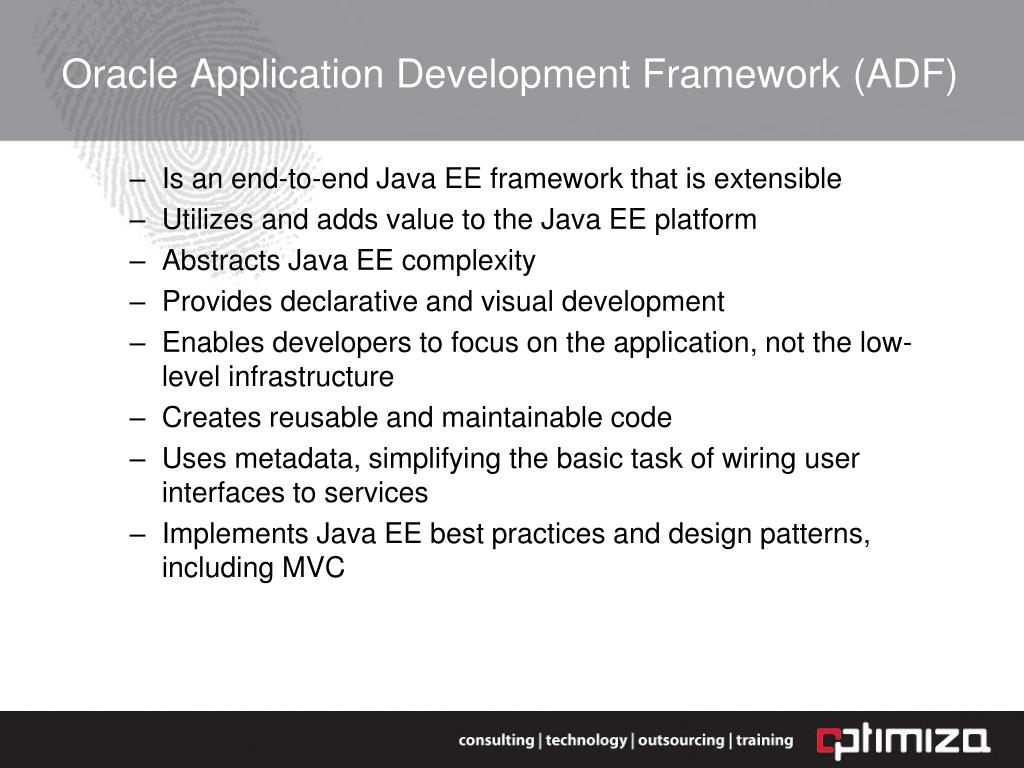 Oracle Application Development Framework (ADF) • Is an end-to-end Java EE framework that is extensible • Utilizes and adds value to the Java EE platform • Abstracts Java EE complexity • Provides declarative and visual development • Enables developers to focus on the application, not the low-level infrastructure • Creates reusable and maintainable code • Uses metadata, simplifying the basic task of wiring user interfaces to services • Implements Java EE best practices and design patterns, including MVC
