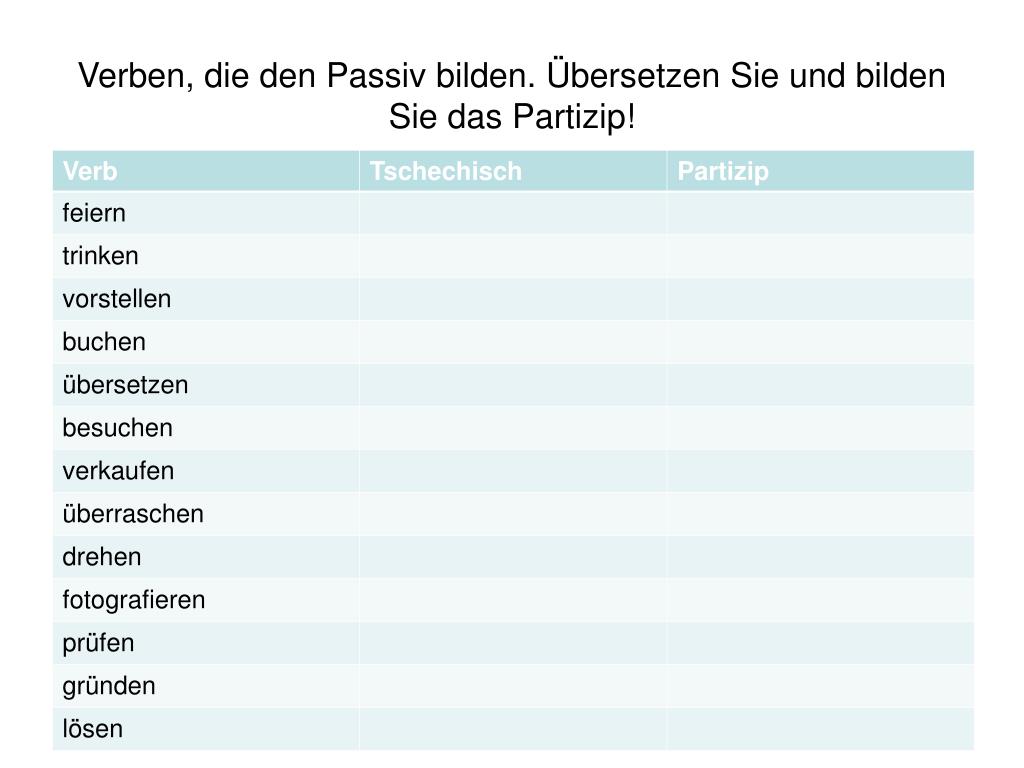 Verben, die den Passiv bilden. Übersetzen Sie und bilden Sie das Partizip!
