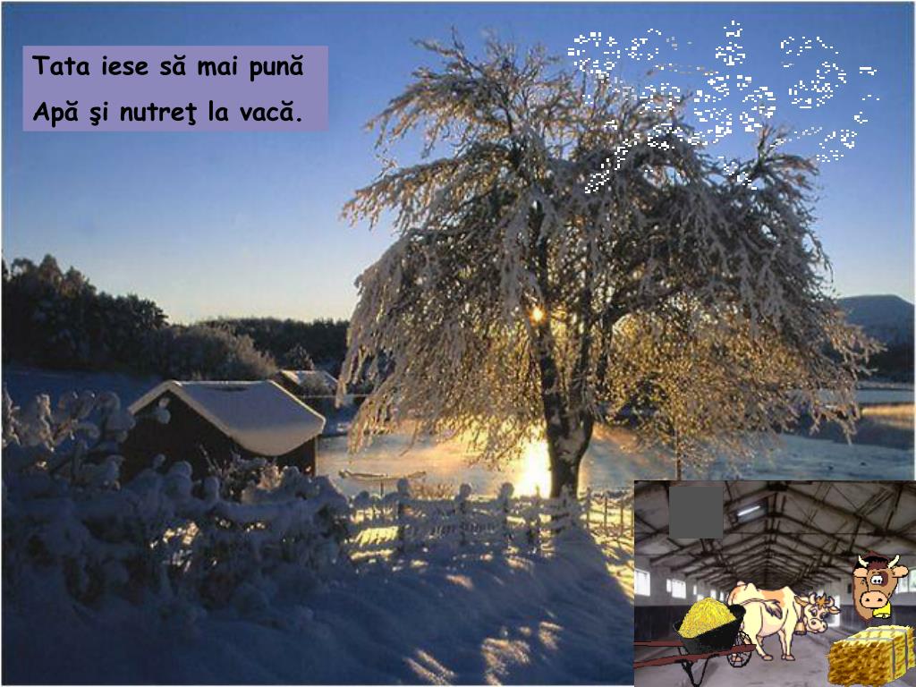 Tata iese să mai pună Apă şi nutreţ la vacă.