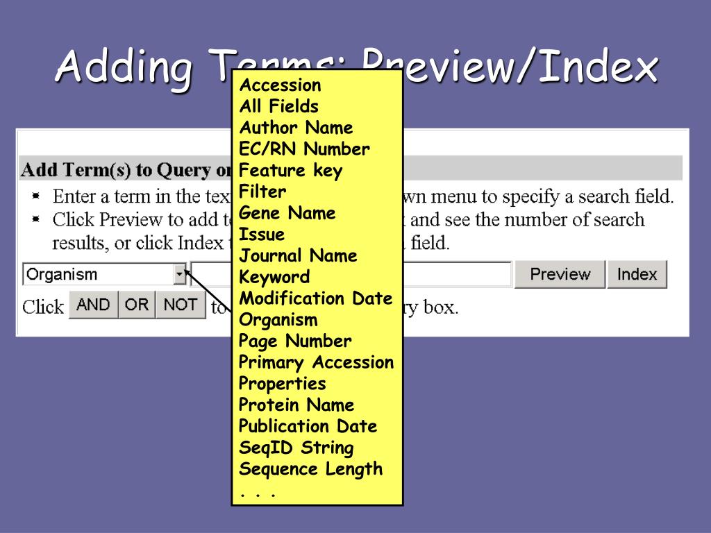 Accession All Fields Author Name EC/RN Number Feature key Filter Gene Name Issue Journal Name Keyword Modification Date Organism Page Number Primary Accession Properties Protein Name Publication Date SeqID String Sequence Length . . . Adding Terms: Preview/Index