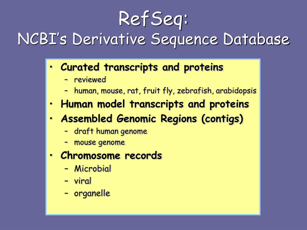 RefSeq: NCBI’s Derivative Sequence Database • Curated transcripts and proteins • reviewed • human, mouse, rat, fruit fly, zebrafish, arabidopsis • Human model transcripts and proteins • Assembled Genomic Regions (contigs) • draft human genome • mouse genome • Chromosome records • Microbial • viral • organelle