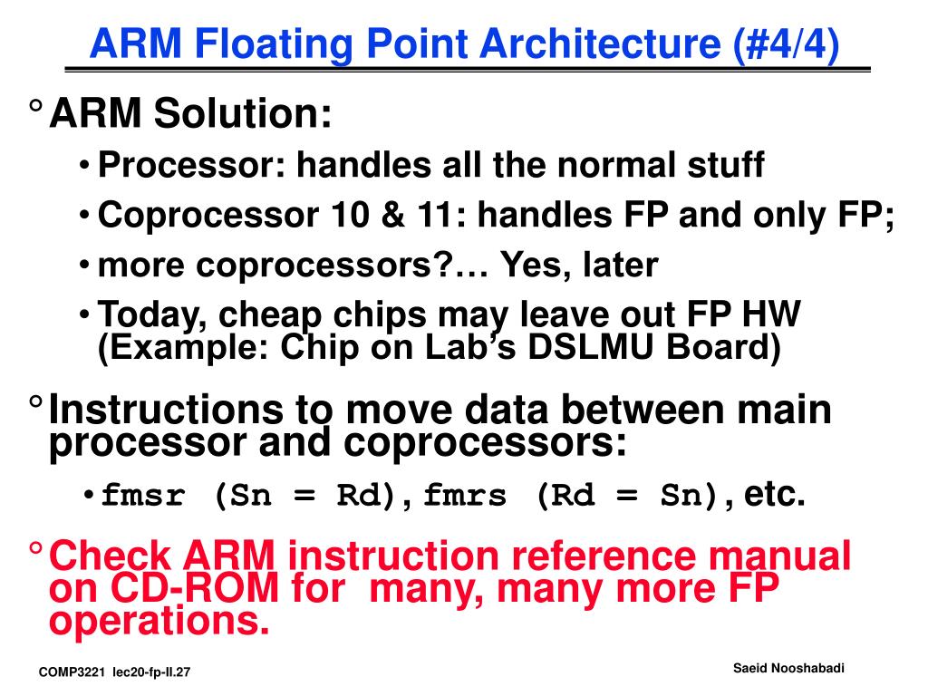ARM Floating Point Architecture (#3/4) • ARM Solution: Make completely separate Co-processors that handles only IEEE-754 FP. • Coprocessor 10 (for SP) & 11 (for DP): • Actually a Single hardware used differently for Single Precision and Double Precision • contains 32 32-bit registers: S0 – S31 • Arithmetic instructions use this register set • separate load and store: flds and fsts(“Float loaD Single Coprocessor 10”, “Float STore …”) • Double Precision: even/odd pair overlap one DP FP number: s0/s1 = d0, s2/s3 = d1, … , s30/s31 =d15 • separate double load and store: fldd and fstd(“Float loaD Double Coprocessor 11”, “Float STore …”)