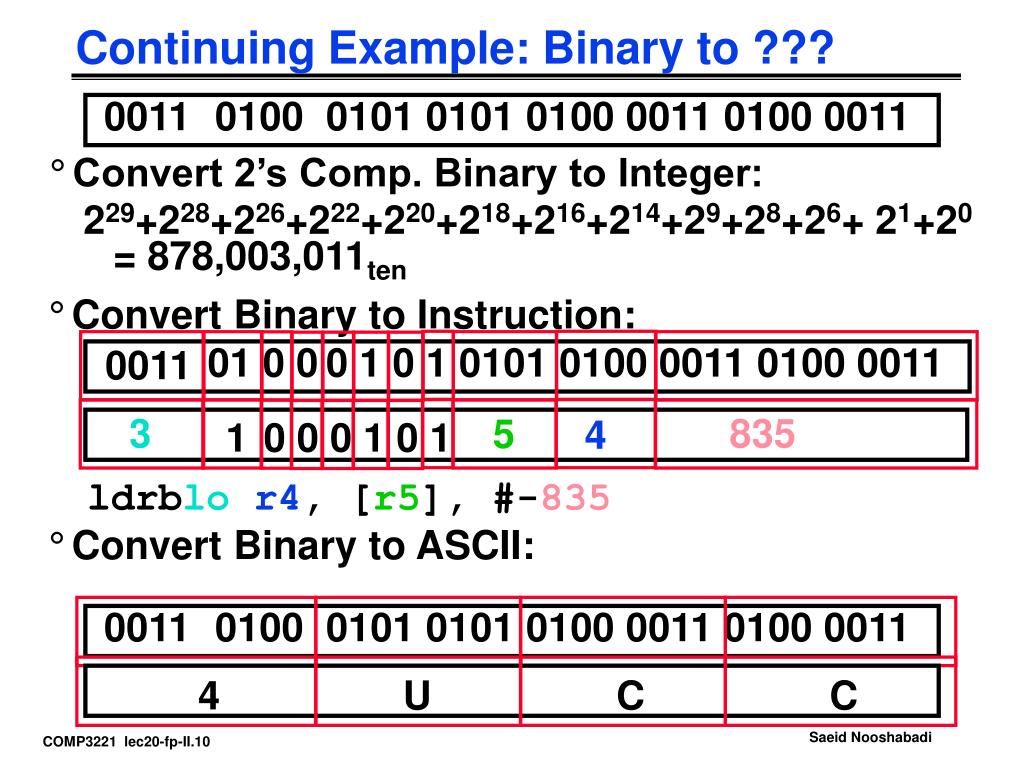 0011 0011 0100 0100 0101 0101 0100 0011 0100 0011 0101 0101 0100 0011 0100 0011 01 0 0 0 1 0 1 0101 0100 0011 0100 0011 0011 3 835 5 4 10 0 0 1 0 1 4 U C C Continuing Example: Binary to ??? • Convert 2’s Comp. Binary to Integer: 229+228+226+222+220+218+216+214+29+28+26+ 21+20 = 878,003,011ten • Convert Binary to Instruction: ldrblor4, [r5], #-835 • Convert Binary to ASCII: