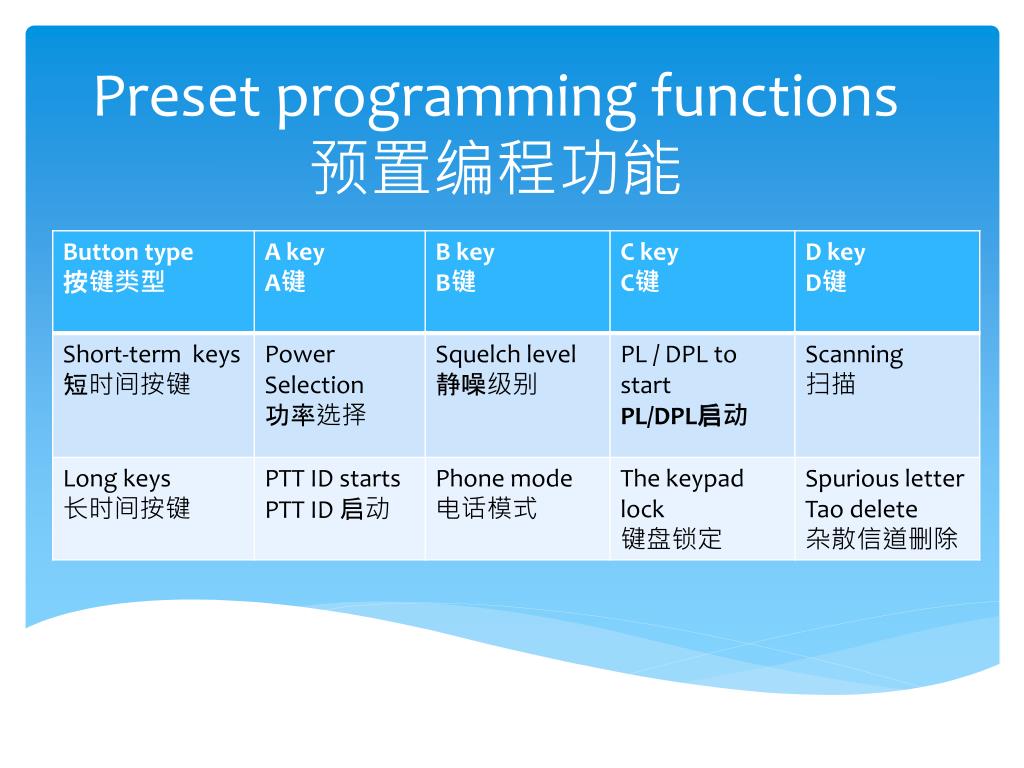 Programming port and mode of编程端口及模式 Programming modeThis mode allows you to enhance the use of walkie-talkie function by changing the characteristic parameters of the walkie-talkie. Enter the programming modeIf the transceiver is turned on, shut down. Then press and hold the listener the key to power. Hear a tone after you in the walkie-talkieProgramming mode. K indicator lights up, then displays the RW, Exit the programming Mode. Shutdown exit the programming mode. 编程模式 这种模式允许您通过改变对讲机的特征参数来增强对讲机的使用功能。 进入编程模式 如果对讲机是开启着,请关机。然后按住监听键开机。听到一声音调之后, 表示您的对讲机处在编程模式。K指示器亮起,然后显示RW。