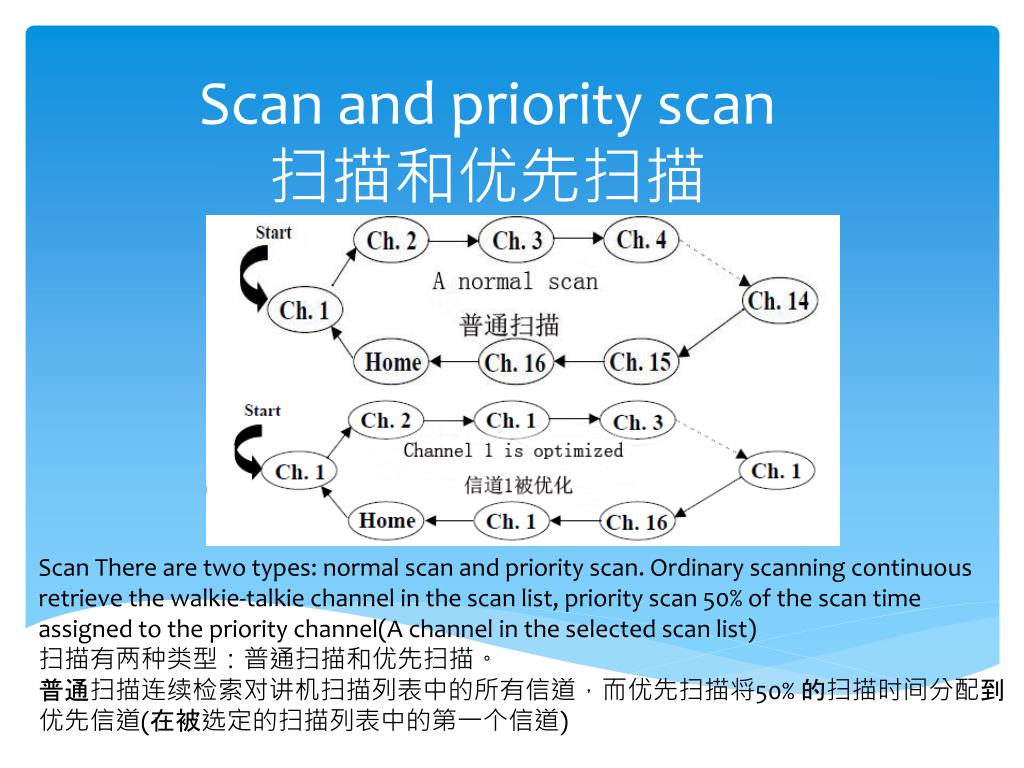 Scan and priority scan扫描和优先扫描 Scan There are two types: normal scan and priority scan. Ordinary scanning continuous retrieve the walkie-talkie channel in the scan list, priority scan 50% of the scan time assigned to the priority channel(A channel in the selected scan list) 扫描有两种类型:普通扫描和优先扫描。 普通扫描连续检索对讲机扫描列表中的所有信道,而优先扫描将50% 的扫描时间分配到 优先信道(在被选定的扫描列表中的第一个信道)