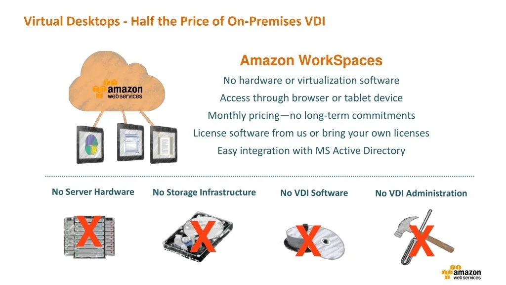 Virtual Desktops - Half the Price of On-Premises VDI Amazon WorkSpaces No hardware or virtualization software Access through browser or tablet device Monthly pricing—no long-term commitments License software from us or bring your own licenses Easy integration with MS Active Directory No Server Hardware No Storage Infrastructure No VDI Software No VDI Administration X X X X