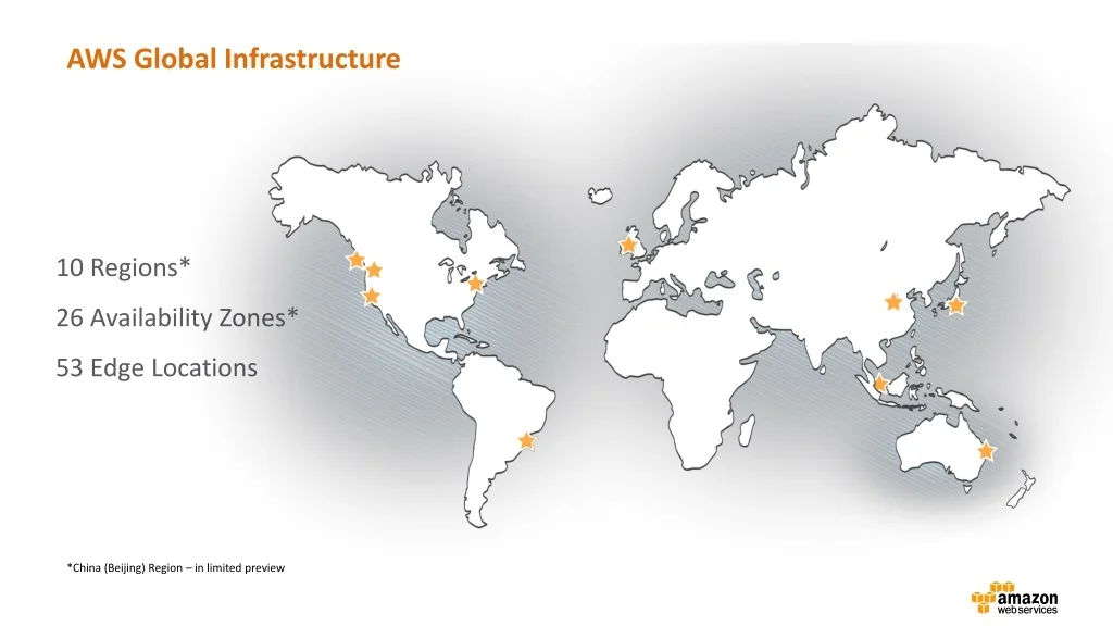 AWS Global Infrastructure 10 Regions* 26 Availability Zones* 53 Edge Locations *China (Beijing) Region – in limited preview