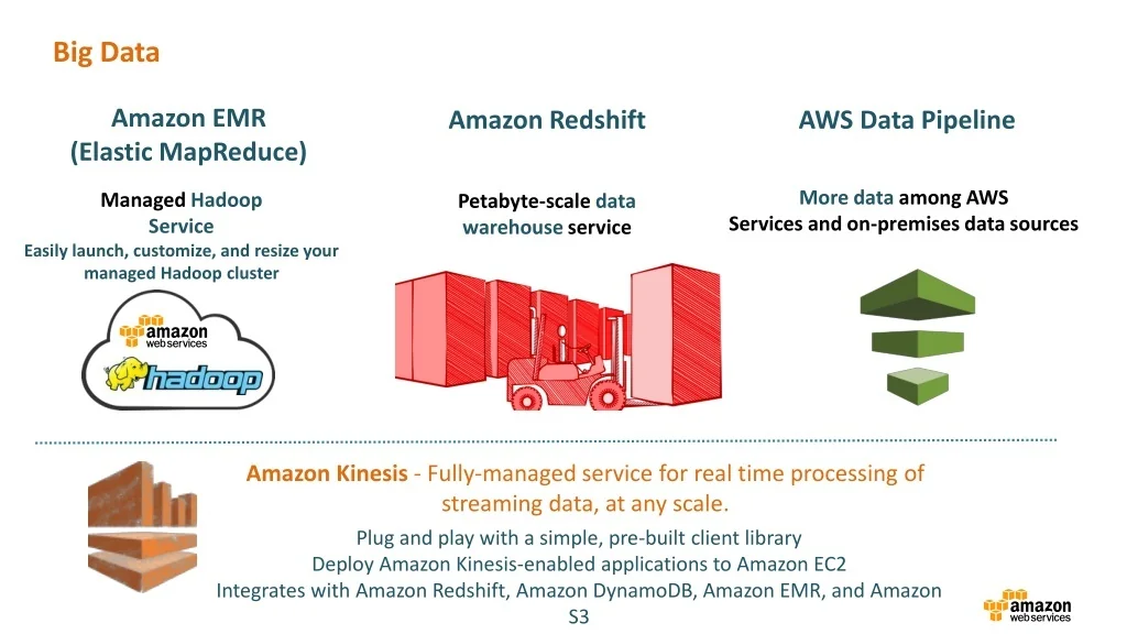 Big Data Amazon EMR (Elastic MapReduce) Amazon Redshift AWS Data Pipeline More data among AWS Services and on-premises data sources Managed Hadoop Service Easily launch, customize, and resize your managed Hadoop cluster Petabyte-scale data warehouse service Amazon Kinesis - Fully-managed service for real time processing of streaming data, at any scale. Plug and play with a simple, pre-built client library Deploy Amazon Kinesis-enabled applications to Amazon EC2 Integrates with Amazon Redshift, Amazon DynamoDB, Amazon EMR, and Amazon S3