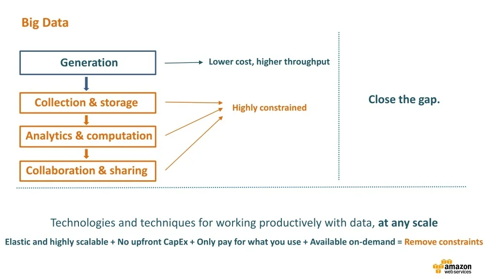 Big Data Generation Lower cost, higher throughput Close the gap. Collection & storage Highly constrained Analytics & computation Collaboration & sharing Technologies and techniques for working productively with data, at any scale Elastic and highly scalable + No upfront CapEx + Only pay for what you use + Available on-demand = Remove constraints