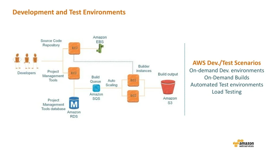 Development and Test Environments AWS Dev./Test Scenarios On-demand Dev. environments On-Demand Builds Automated Test environments Load Testing