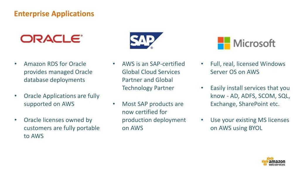 Enterprise Applications • Full, real, licensed Windows Server OS on AWS • Easily install services that you know - AD, ADFS, SCOM, SQL, Exchange, SharePoint etc. • Use your existing MS licenses on AWS using BYOL • Amazon RDS for Oracle provides managed Oracle database deployments • Oracle Applications are fully supported on AWS • Oracle licenses owned by customers are fully portable to AWS • AWS is an SAP-certified Global Cloud Services Partner and Global Technology Partner • Most SAP products are now certified for production deployment on AWS