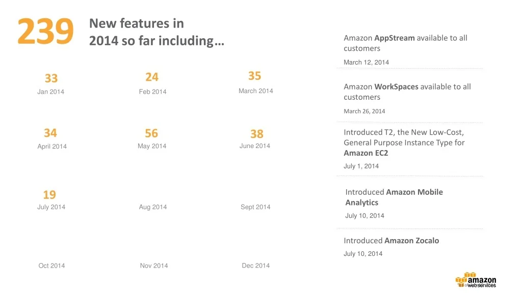 239 New features in 2014 so far including … Amazon AppStreamavailable to all customers March 12, 2014 35 24 33 Amazon WorkSpacesavailable to all customers March 26, 2014 March 2014 Jan 2014 Feb 2014 34 56 38 Introduced T2, the New Low-Cost, General Purpose Instance Type for Amazon EC2 July 1, 2014 June 2014 May 2014 April 2014 Introduced Amazon Mobile Analytics July 10, 2014 19 Aug 2014 Sept 2014 July 2014 Introduced Amazon Zocalo July 10, 2014 Dec 2014 Oct 2014 Nov 2014 *as of July 12, 2014