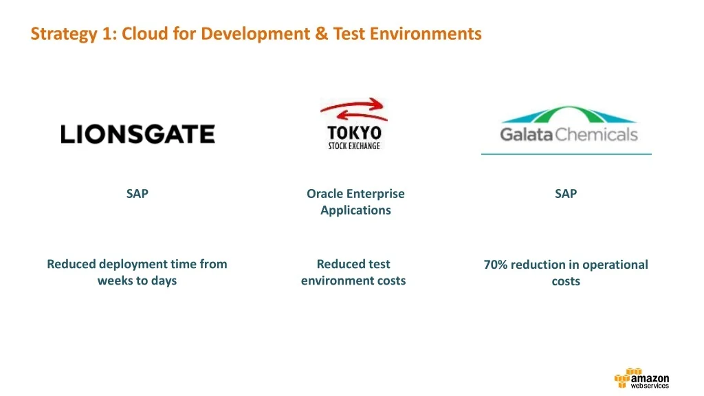 Strategy 1: Cloud for Development & Test Environments Oracle Enterprise Applications SAP SAP Reduced test environment costs Reduced deployment time from weeks to days 70% reduction in operational costs