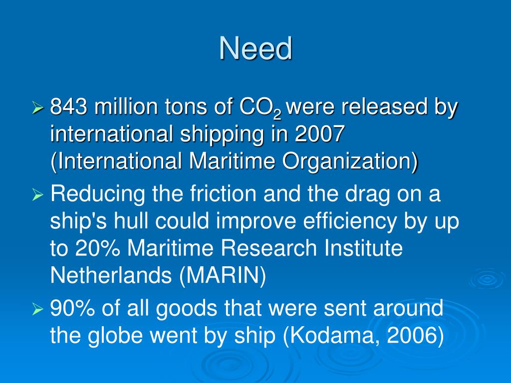 Need • 843 million tons of CO2 were released by international shipping in 2007 (International Maritime Organization) • Reducing the friction and the drag on a ship's hull could improve efficiency by up to 20% Maritime Research Institute Netherlands (MARIN) • 90% of all goods that were sent around the globe went by ship (Kodama, 2006)