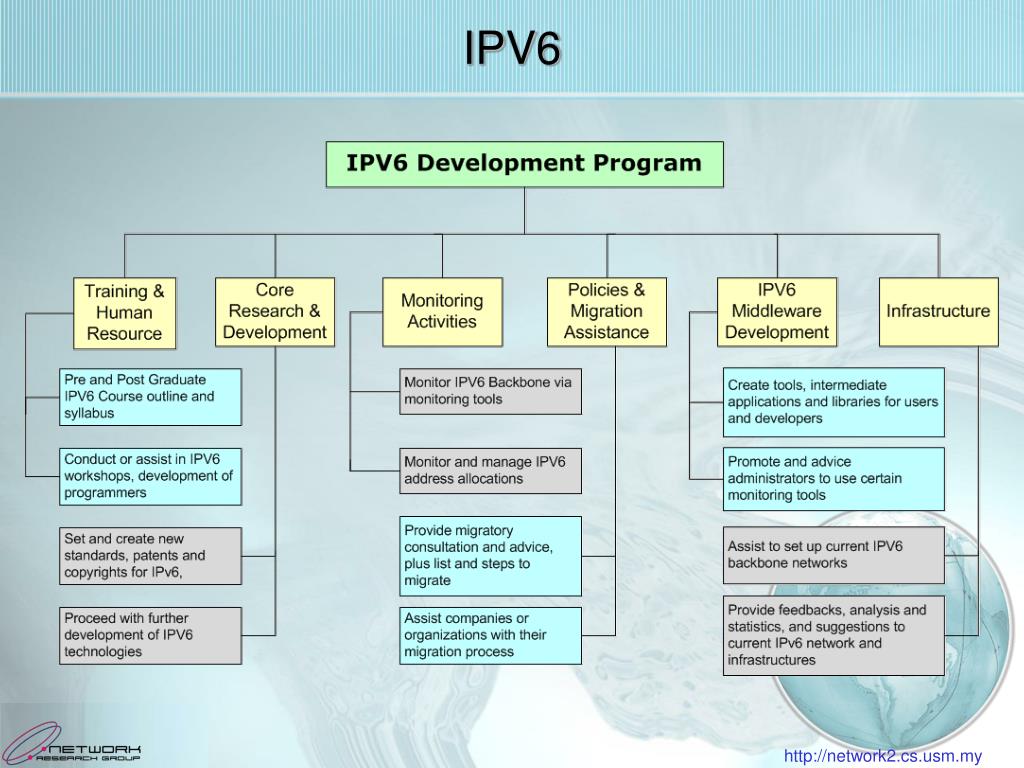 Wireless & Satellite Networking (2) • Satellite Networking • Infrastructure/ Connectivity Research (R&D) • AI3 Malaysia • USM/UPM/TP/MEASAT Sat. Services (MEASAT2) • NRG Exchange Point (NRGXP) btw. MY networks & AI3/APAN • Connecting IPv4 islands over IPv6 ocean • Satellite Protocol Development (R) • Unidirectional Links for multicast traffic (AI3 WG) • UDL-Mesh (IRPA) -> Commercialization potential • IPv6 over Multihop Satellite Network (AI3/ MEASAT2)