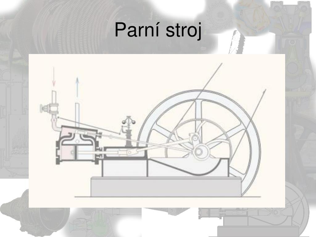 Parní stroj • Je pístový tepelný stroj, přeměňující tepelnou energii vodní páry na energii mechanickou, nejčastěji rotační pohyb • Velmi nízká účinnost – max. 5% - 15% • Vynález připisován Jamesi Wattovi roku 1765 (pouze ale zdokonalil vynález Thomase Savera z r. 1698) • V prvopočátku založen na kondenzaci vody – vzniklý podtlak • 19. století stoletím páry – mnoho Wattových patentů • Ve 20. století postupně vytlačeny elektrickými zařízeními z průmyslových podniků a spalovacími motory z dopravy