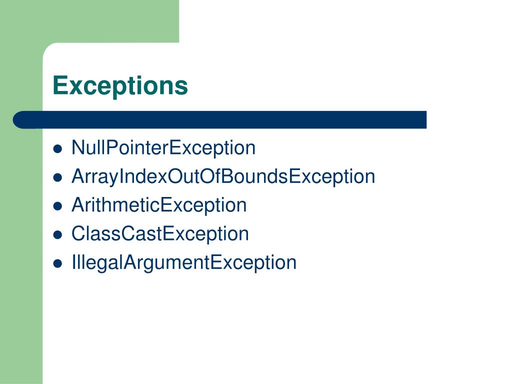 Exceptions • NullPointerException • ArrayIndexOutOfBoundsException • ArithmeticException • ClassCastException • IllegalArgumentException