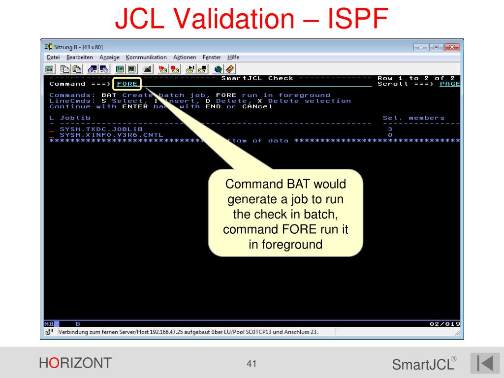 JCL Validation – ISPF Command BAT would generate a job to run the check in batch, command FORE run it in foreground