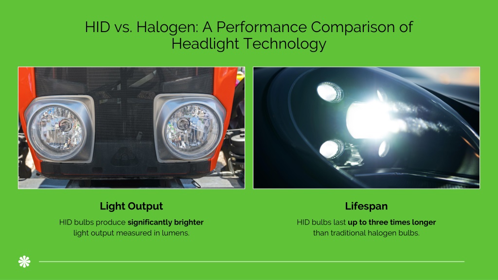 Light Output • Lifespan • HID vs. Halogen: A Performance Comparison of Headlight Technology • HID bulbs produce significantly brighter light output measured in lumens. • HID bulbs last up to three times longer than traditional halogen bulbs.